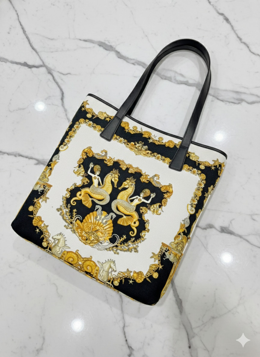 This authentic tote features a rich print known as the "Foulard" design, blending regal iconography with vibrant color execution. It is the perfect size for daily essentials or a chic weekend getaway.