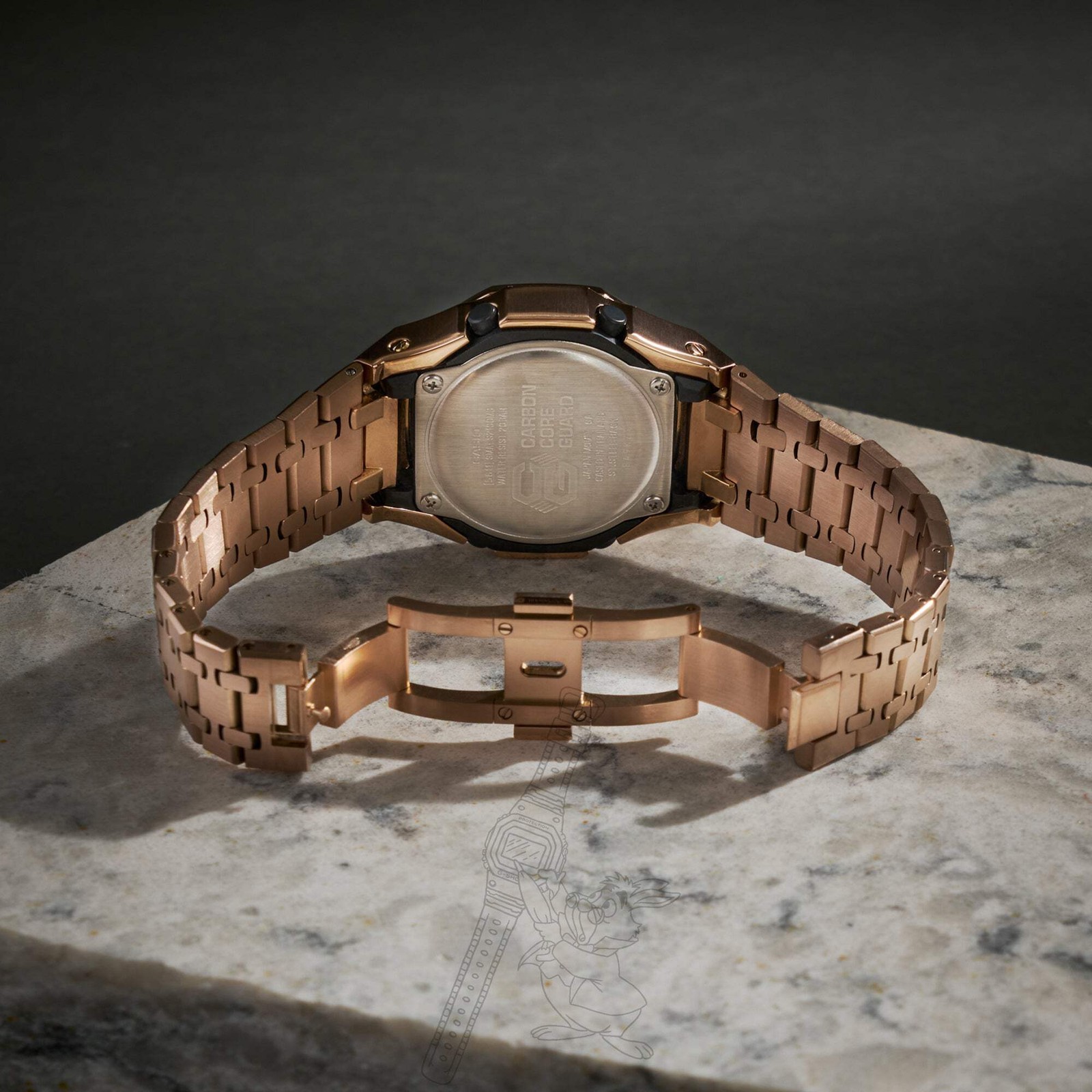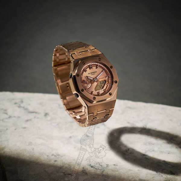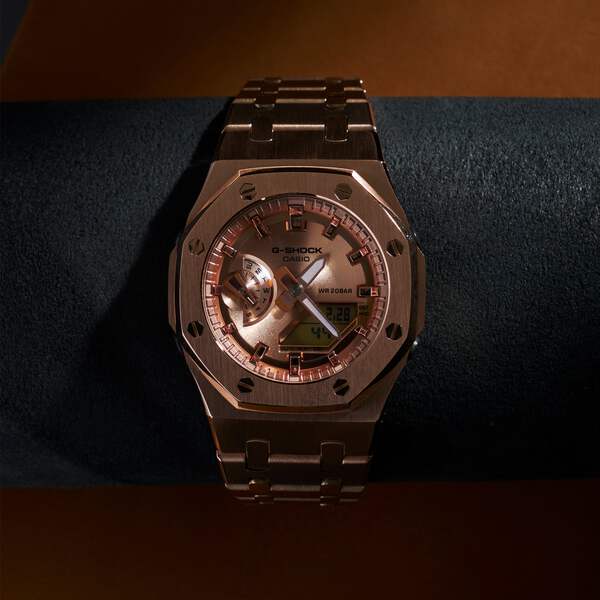 Handcrafted in Brooklyn, New York, each piece is built to order for collectors and enthusiasts who demand something different.Our custom mods are designed for comfort, durability, and standout style. Base Model: GMA-S2100MD-1ACase: Stainless Steel, Rose Gold IP PlatedSize: 42.2mm case / 40mm bezel / 12mm thicknessBracelet: Stainless Steel with a butterfly deployment clasp, Rose Gold IP Plated Includes original G-Shock bezel and band for added versatility.Custom requests welcome — let’s build something unique.