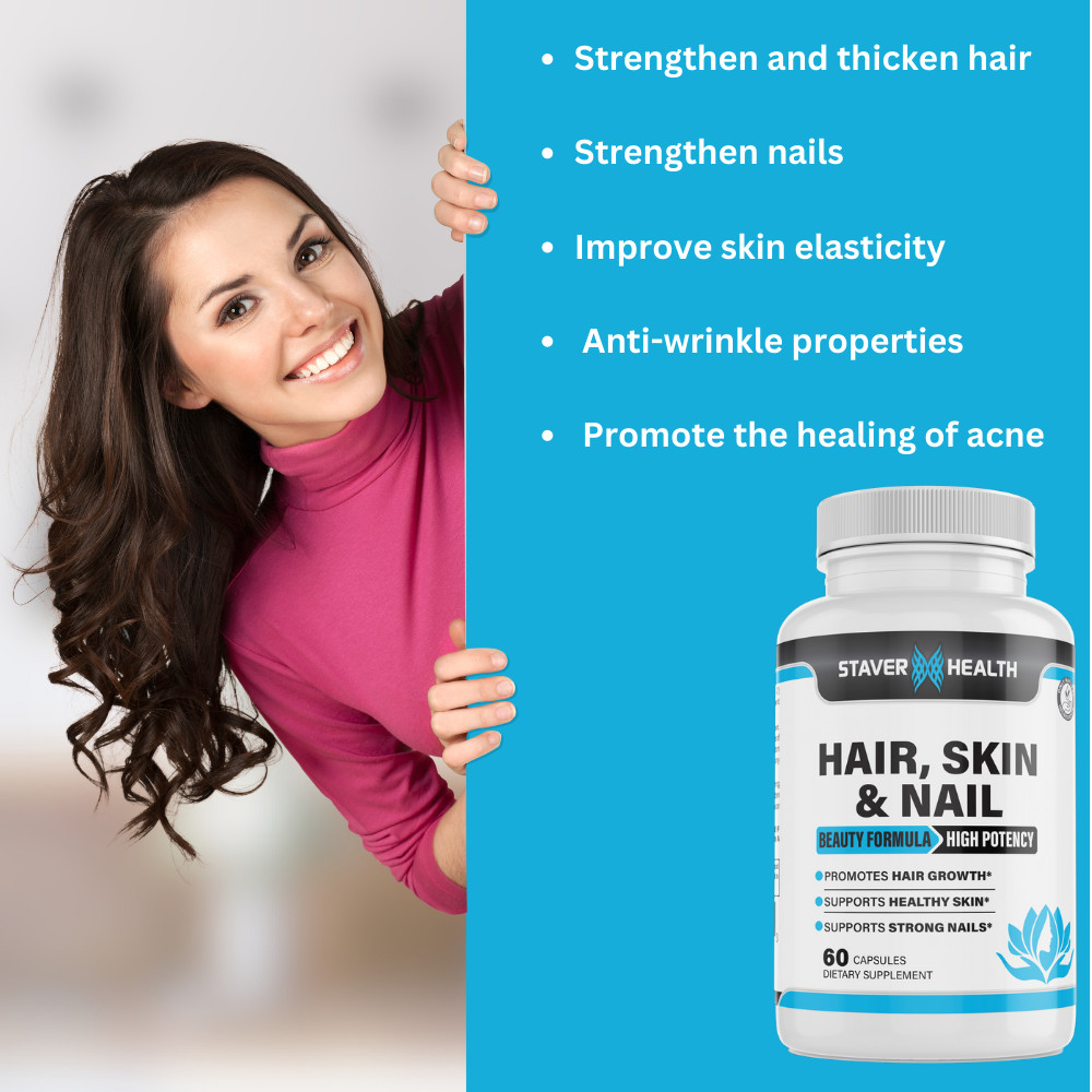 • Hair Skin & Nails is our beauty formula that is designed to grow longer stronger healthier hair, and better the look and health of the skin and nails.