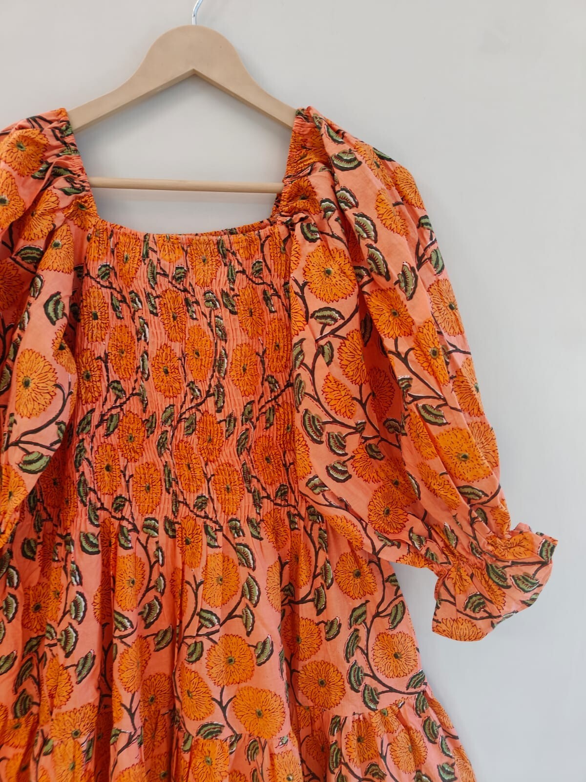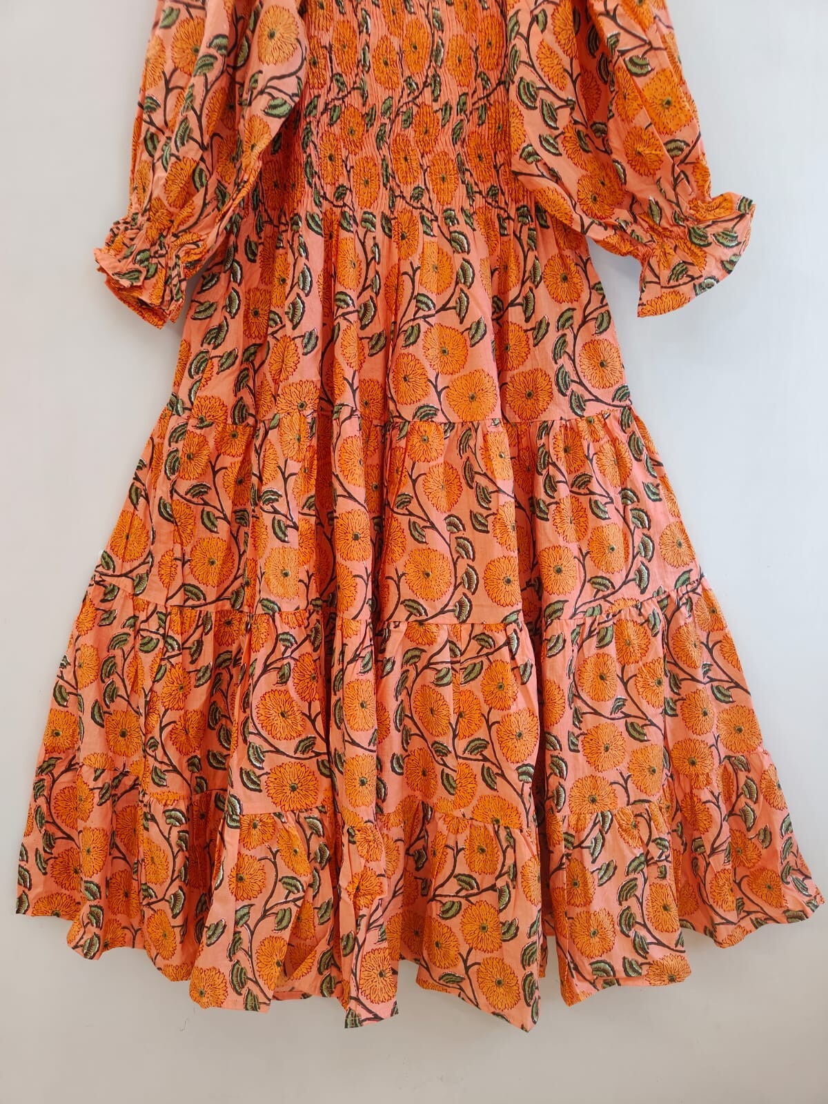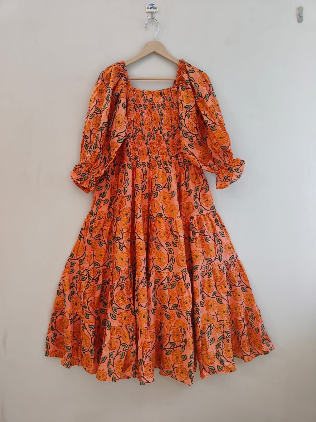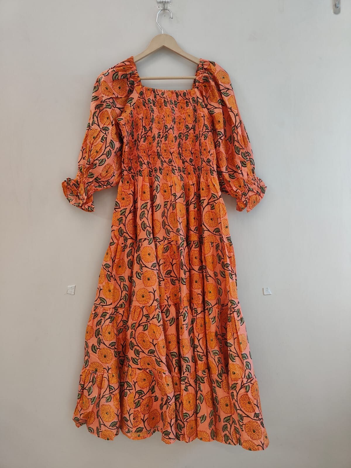 Women Dress, Cotton Handblock Print Dress, Women wear long maxi dress, Square Neckline with Smocking Maxi Dress, Cotton summer dress