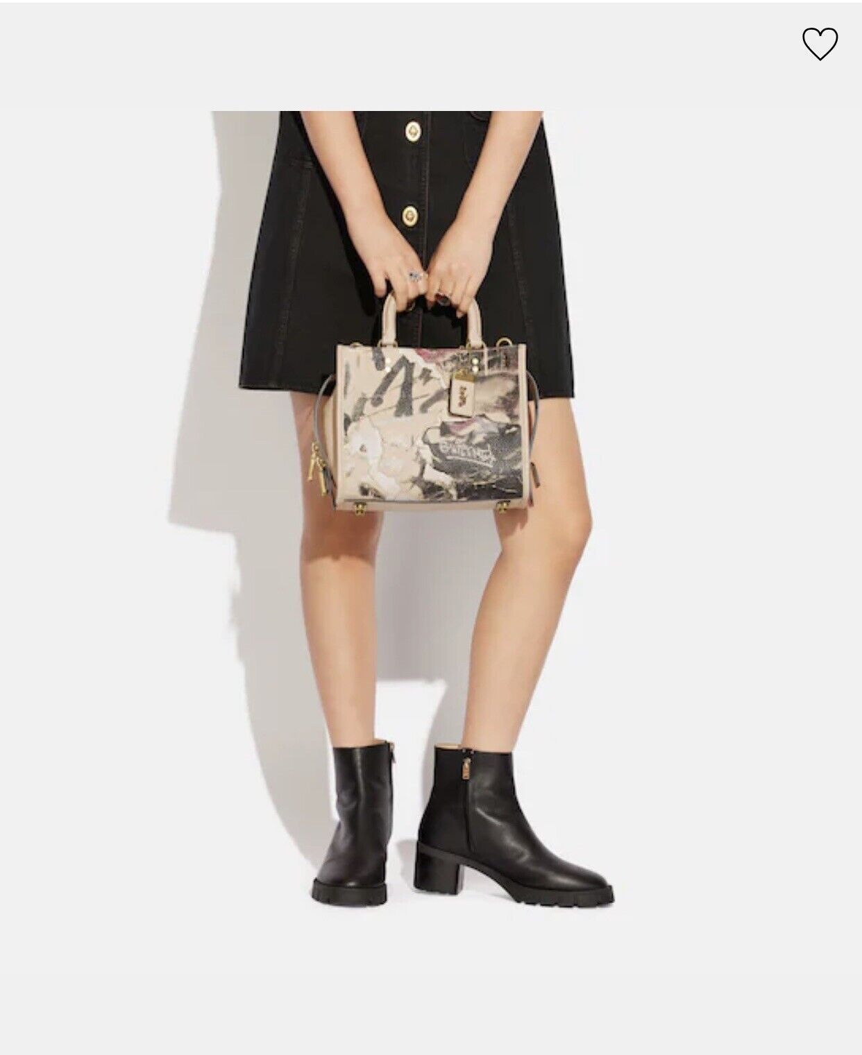 The spacious style is crafted of natural pebble leather detailed with a bold motif from the rebel artists’ compositions.