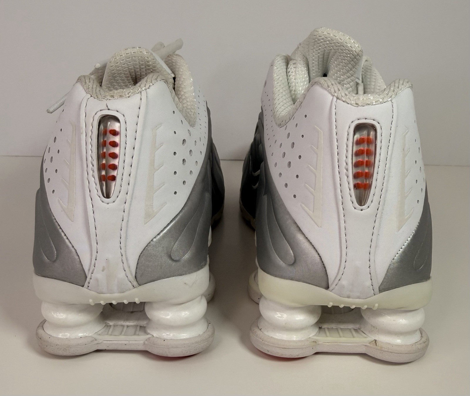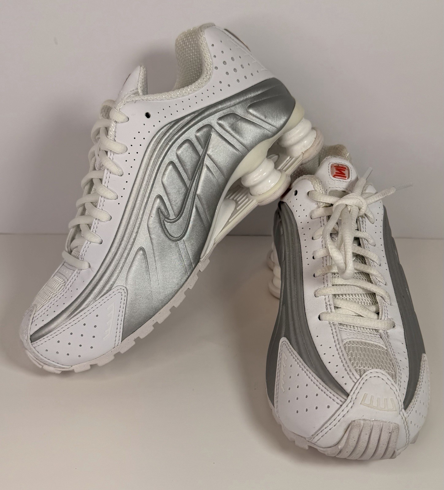 The Nike Shox R4 Women's Fashion Sneakers in White Silver size 6 US are a stylish and comfortable option for casual wear. Featuring a lace-up closure, rubber outsole, and textile lining, these trainers offer great support and durability. With a sleek design and silver accents, these sneakers are perfect for walking and everyday activities. The model, SHOX R4, is part of the Nike product line and has a standard shoe width, ensuring a comfortable fit for women looking for both fashion and functionality in their footwear.