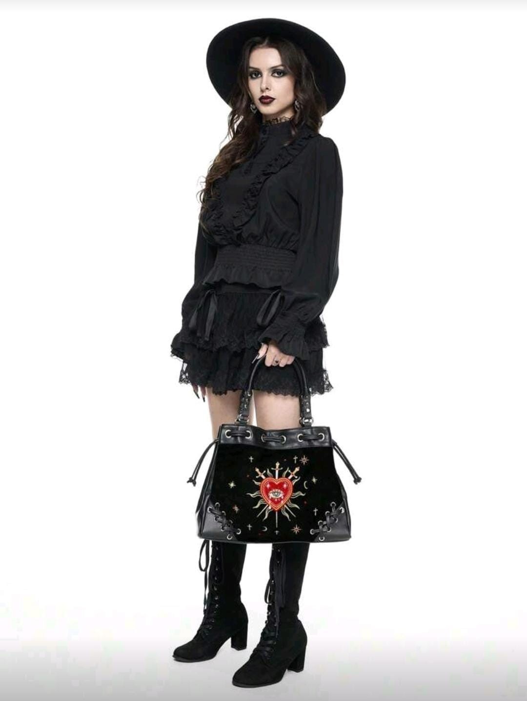 This stylish Punk Tote Bag Purse is perfect for those who embrace goth fashion. The large tote features a solid black exterior made of polyurethane, with a black polyester lining. It has double handles for easy carrying and black hardware accents. Ideal for various occasions, this tote is a must-have for any fashion-forward person looking to make a statement. The gothic theme and matte finish add to its edgy appeal, making it a unique and eye-catching accessory.