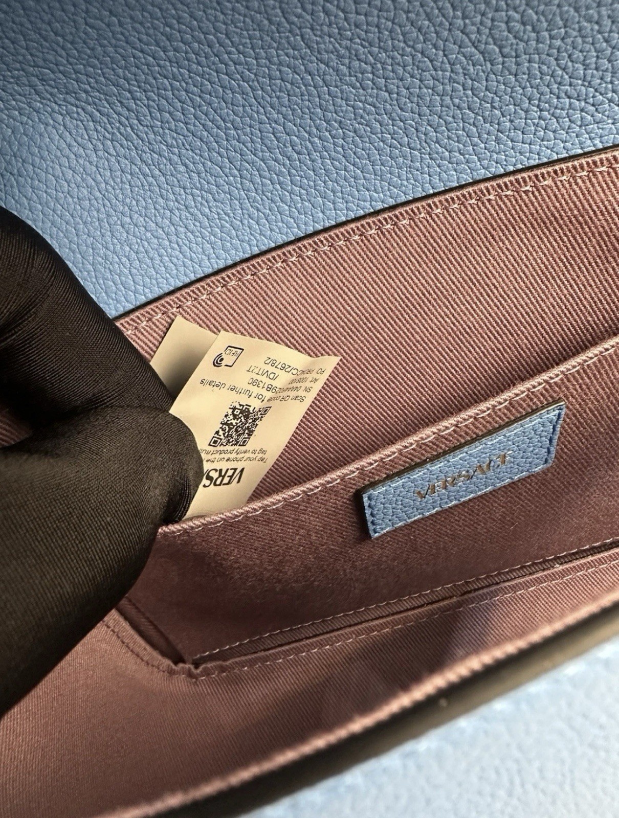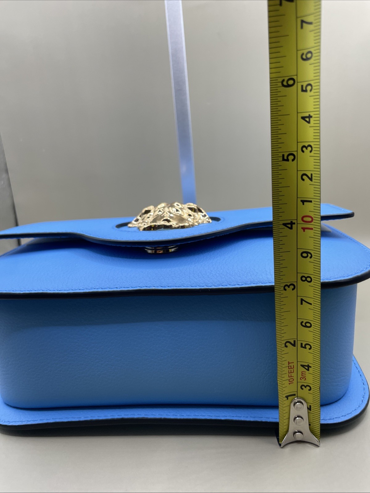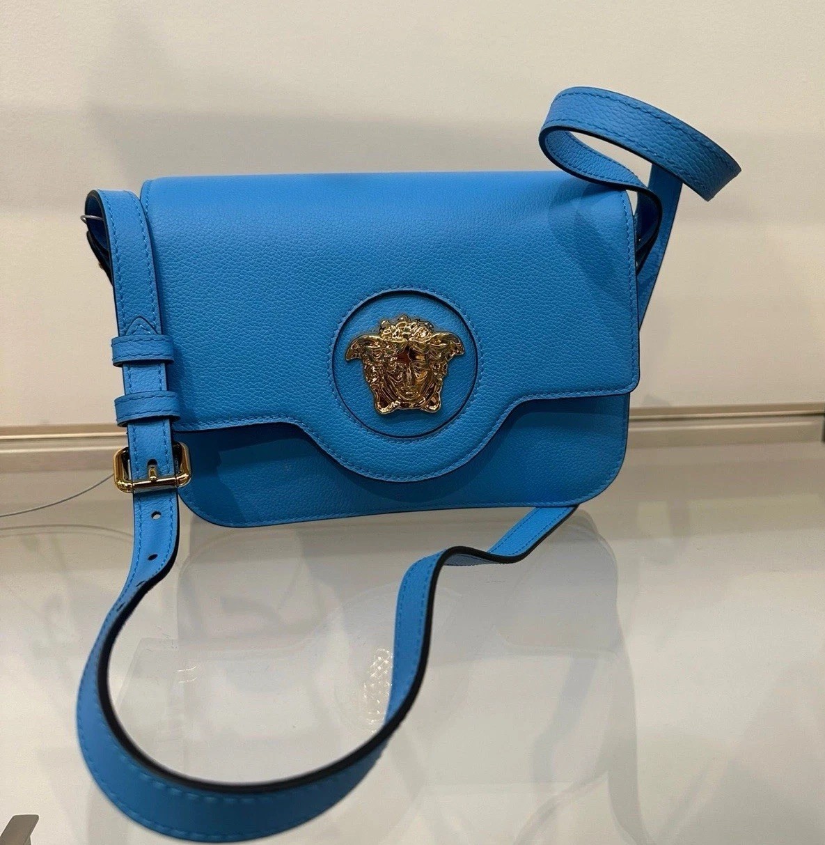 The Versace La Medusa Logo Plaque Blue Pebbled Leather Crossbody Bag is a luxurious and stylish accessory for women. Made in Italy with high-quality leather, this small-sized bag features a magnetic closure, gold hardware, and a pebbled finish. The striking blue exterior color, combined with the iconic Versace La Medusa logo plaque, adds a touch of designer flair to any outfit. The crossbody style and comfortable blue leather strap make it easy to carry, while the purple leather lining adds a pop of color. This new $1600 bag is a statement piece that exudes sophistication and fashion-forward style.