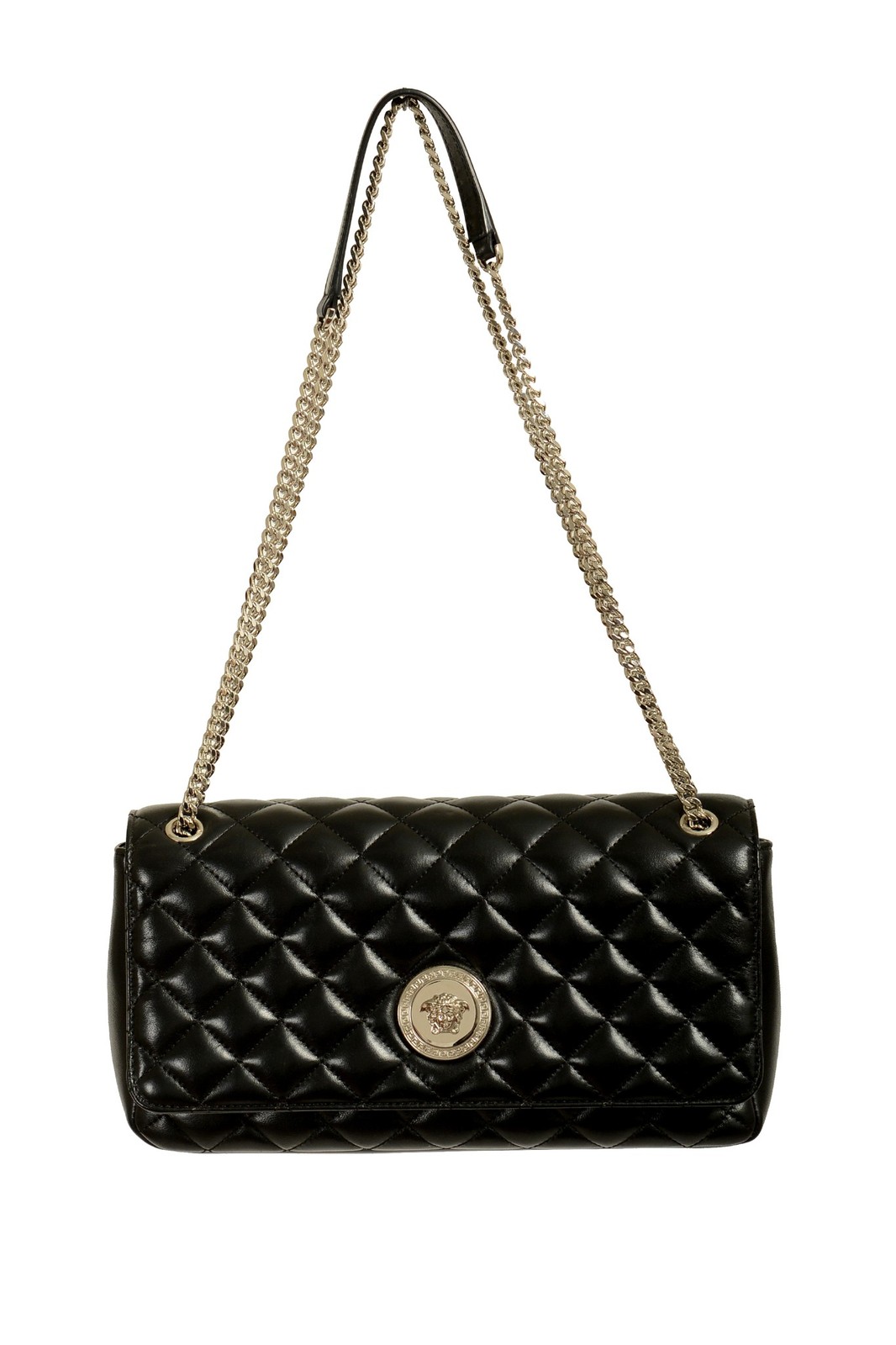 This is authentic Versace Women's Black Leather Silver Medusa Quilted Handbag Shoulder Bag